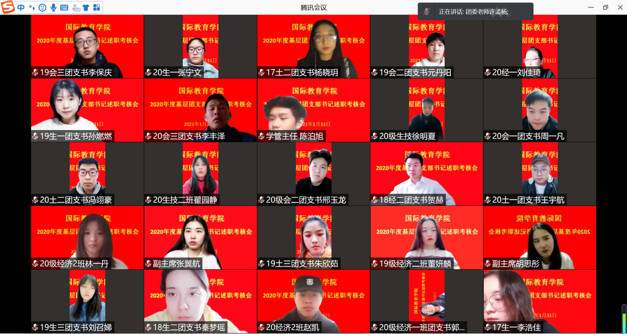 本次述职评议考核的主要内容围绕班级团支部青年大学习的学习情况、班级团组织的团日活动开展、加强团组织的自身建设等方面展开。会上,全院36个班级团支部书记按照公司团委2020年重点工作计划和公司特色等方面,对本班级2020年度共青团工作进行总结回顾。各班级团支部的团支书通过具体举例,展示beat365亚洲体育官方网站基层团支部建设取得的各项成就,并通过团支部内部的自我总结,找出基层团支部发展过程中仍存在的问题并提出解决方案。各团支部在对未来的展望中都提出要继续保持初心,保持认真负责的心态来面对以后的工作。会议最后,团委老师许孟杨对各团支部书记的述职进行了总结,并交代部署了近期工作,鼓励各班级团支书动员全体同学参加团省委“青心聚力,基层有我”志愿服务活动,及时做好宣传和总结工作,照常组织第二课堂学习活动。