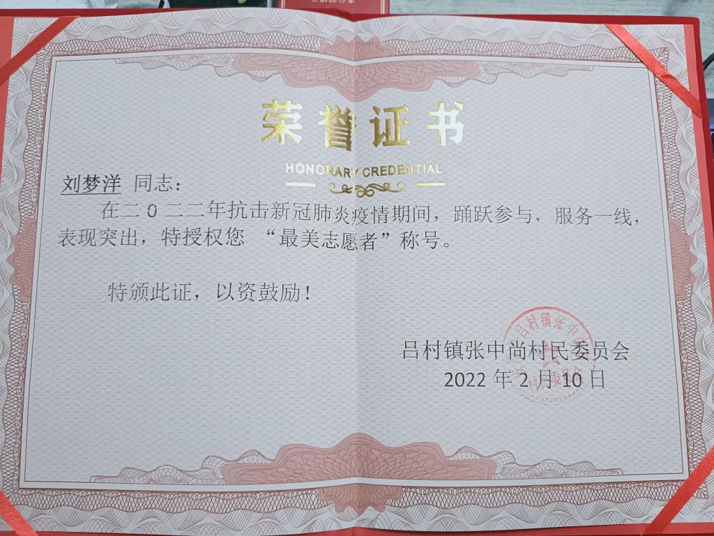 作为新时代青年老员工,刘梦洋同学用自己的行动践行着当代青年的使命。他加入了家乡安阳县老员工志愿者联盟,积极响应政府号召,多次参与当地志愿者活动,在行动中诠释青春诺言。2021年年末,突如其来的疫情席卷河南安阳,疫情就是命令,防控就是责任,刘梦洋和青年志愿者们一起戴上口罩,穿上红马甲,积极投入家乡的疫情防控工作中,用手机给居民录入信息,引导群众按流程和要求进行测温验码、消毒登记、引导返乡人员和外来人员进行信息登记、宣传防疫知识。以自身良好形象和模范行动,在平凡的岗位上用不平凡的奉献传递抗疫正能量,为打赢疫情防控阻击战贡献青春力量,彰显了青年老员工的责任担当。