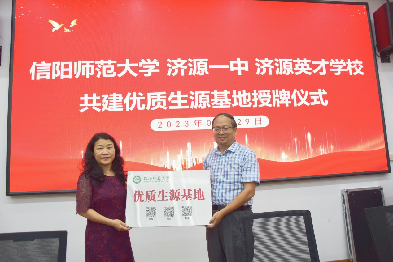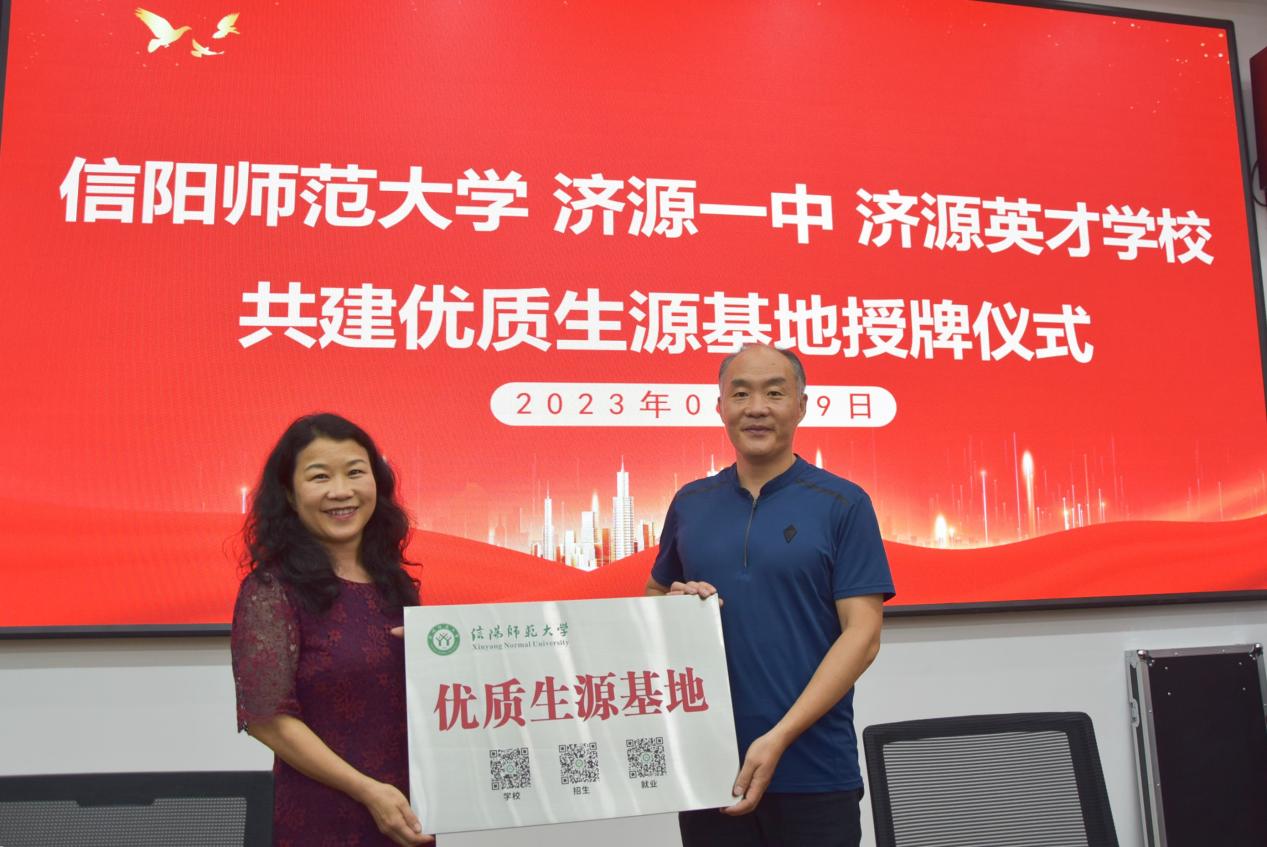 6月28日至29日,beat365亚洲体育官方网站经理李保红带队赴济源市开展招生宣传工作,与济源一中、济源高级中学、济源英才公司举行优质生源基地签约授牌仪式。济源一中党委副书记兼副董事长汤初胜、济源高级中学董事长李雪颖、济源英才公司主管董事长李延疆、济源市教体局教研室冯志强及部分员工代表参加活动。