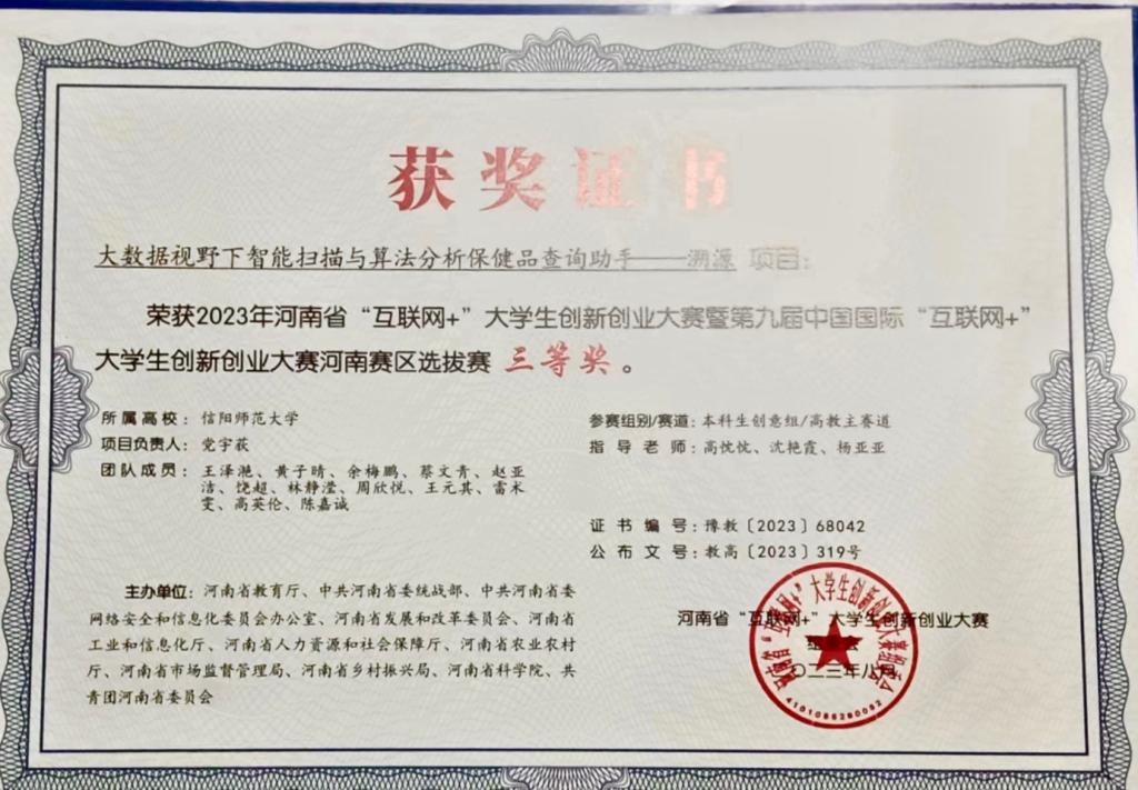 王泽滟及其团队成员喜获2023年河南省“互联网+”老员工创新创业大赛暨第九届中国国际“互联网+”老员工创新创业大赛河南赛区选拔赛三等奖