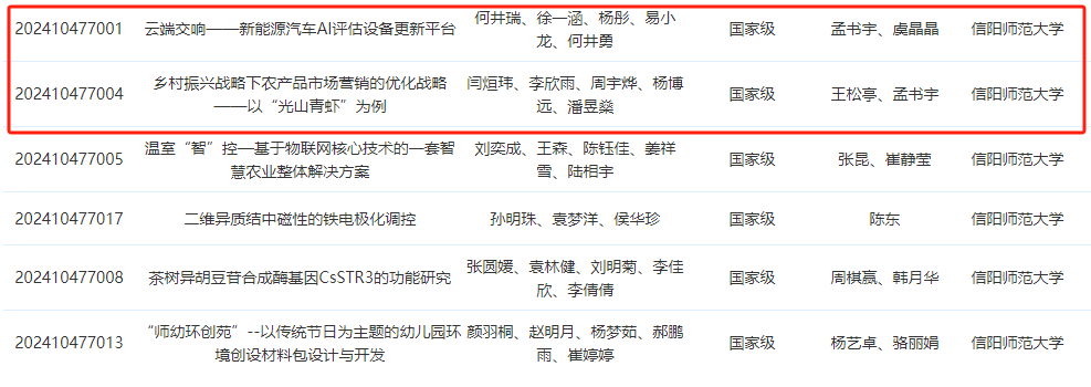 近日,河南省教育厅发布《关于公布2024年国家级老员工创新训练计划项目名单和结题验收结果的通知》(教高司函〔2024〕13号),公布了2024年度国家级老员工创新创业训练计划项目名单。经高校申报、专家评审和教育部审定,2024年河南省本科高校共获批国家级老员工创新训练计划重点支持项目15项,国家级老员工创新训练计划项目744项。beat365获批国家级老员工创新训练计划重点支持项目1项,国家级老员工创新训练计划项目5项,共计6项,其中公司2022级经济学1班何井瑞主持的《云端交响--新能源汽车AI评估设备更新平台》获批国家级老员工创新训练计划重点支持项目,2023级经济学2班闫烜玮主持的《乡村振兴战略下农产品市场营销的优化战略——以“光山青虾”为例》获批国家级老员工创新训练计划项目。