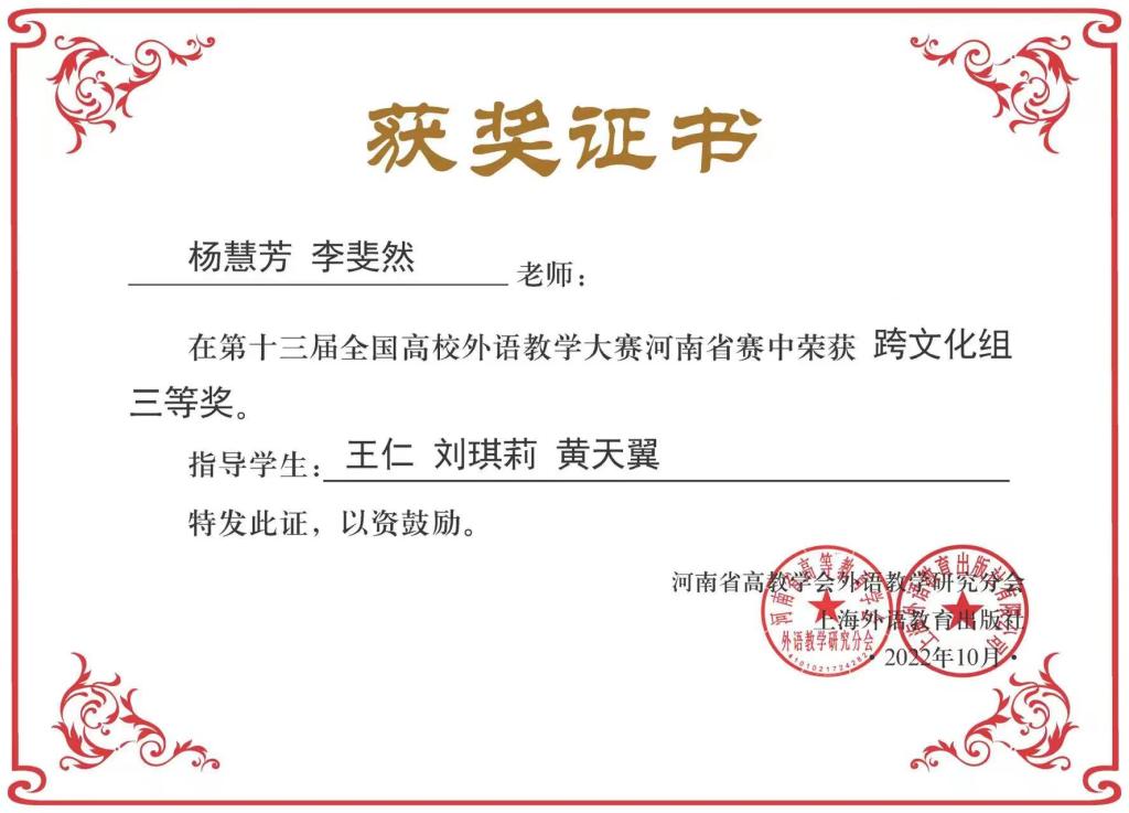 第十三届全国高校外语教学大赛河南省赛在郑州胜利闭幕,由公司英语教研室主任李斐然担任指导教师,2020级会计学1班员工刘琪莉,2019级会计学2班员工黄天翼组成的参赛队伍经过案例表演、评委问答、组委会终评等环节,从全省50余所本科院校103名选手中脱颖而出,斩获“跨文化组”三等奖。