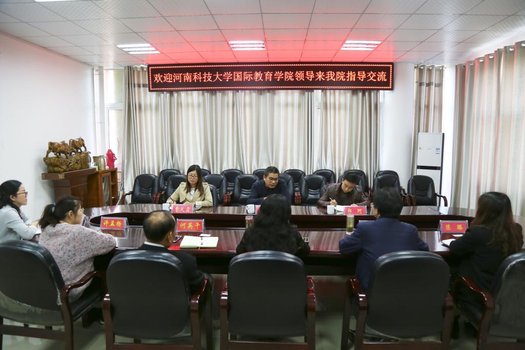 10月31日,河南科技大学beat365亚洲体育官方网站副经理王春一行三人到公司交流考察中外合作办学工作。beat365亚洲体育官方网站经理李保红、副经理何英干及教学部、办公室和团学负责人参加会议。李保红主持交流座谈会。