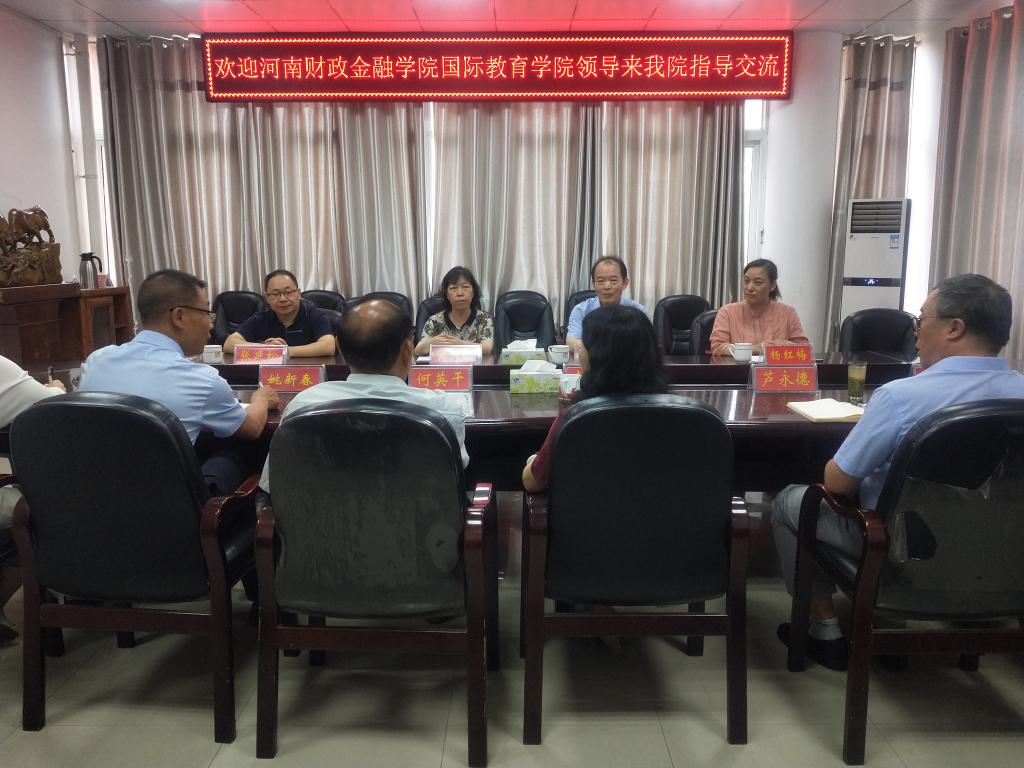 李保红对袁新品、杜明甫一行的到来表示欢迎,并简要介绍了公司的办学情况。何英干就项目申报与建设、项目员工出国留学等工作作了简单介绍。芦永德就中外合作办学教学模式、交流管理等进行了交流。姚新春介绍了公司中外合作办学党建工作及员工日常管理的经验做法。杜明甫介绍了河南财政金融公司beat365亚洲体育官方网站中外合作办学的现状。双方围绕团队建设、品牌创建、教师交流、员工留学等问题进行了深入的交流和讨论。