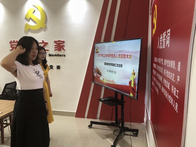 宣誓大会进行第一项,全体与会人员起立,奏唱《国际歌》。随后,教工党支部副书记郭寻宣读了公司党委组织部关于接收新党员的便函。在组织委员朱妍妍的带领下,预备党员李斐然郑重地举起右手,面向党旗,庄严宣誓。宣誓毕,李斐然同志作了表态发言,表示要更加严格要求自己,对党忠诚,努力工作,为公司发展做出贡献。