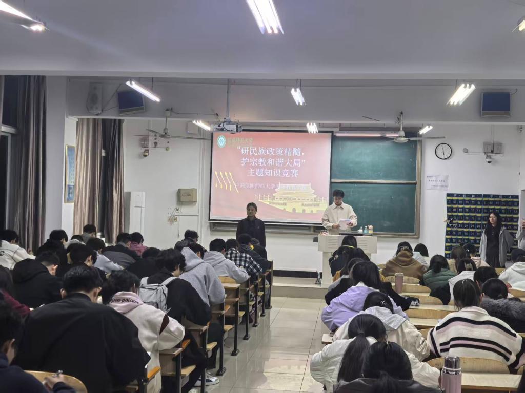 为深入学习贯彻习近平总书记关于民族宗教工作的重要论述,推动中国特色社会主义民族宗教理论入脑入心,提升师生对党的民族宗教政策和国家法律法规的理解与认同,11月2日晚,beat365亚洲体育官方网站在俊采楼202教室举办“研民族政策精髓,护宗教和谐大局”主题知识竞赛。
